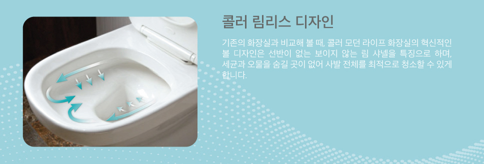 모던라이프 변기 내부 볼에 적용된 콜러 항균유리는 박테리아와 세균을 죽일 수 있는 혁신적인 기술이다. 항균제는 표면 코팅이 아니라 발사 전 사발의 세라믹에 내장돼 변기의 최적의 위생을 위해 세균과 박테리아로부터 오래 지속되는 효과적인 보호를 제공합니다.
